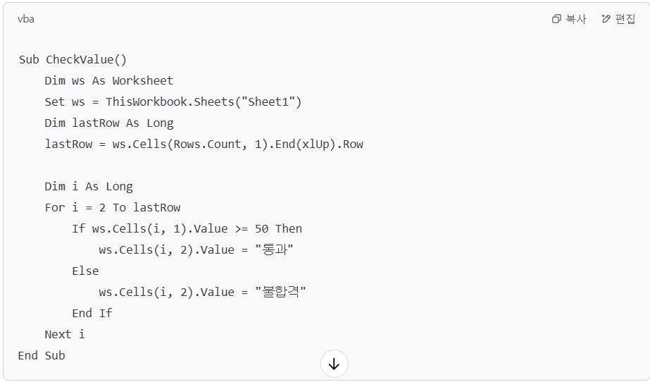 💬 "Excel에서 A열의 값이 50 이상이면 자동으로 B열에 '통과'라고 입력하는 VBA 매크로 코드를 만들어줘."